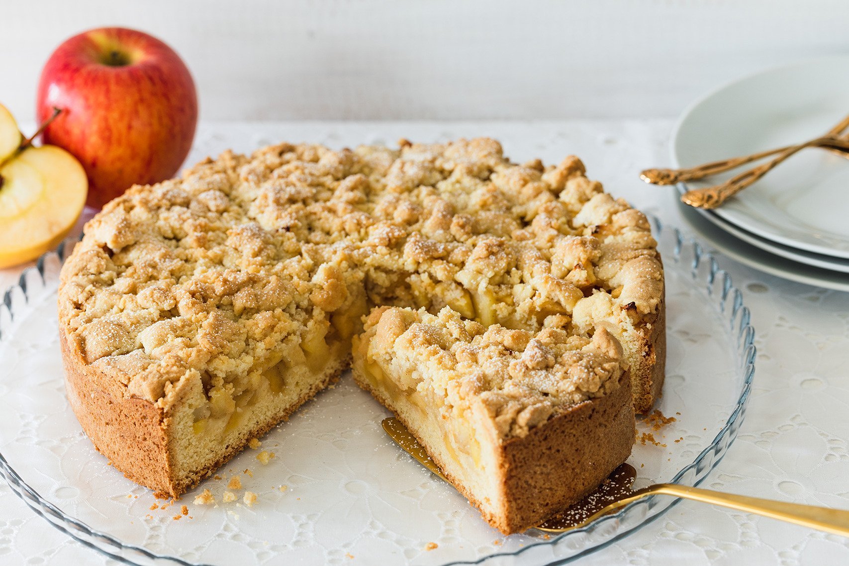 Ein Klassiker ist der Streuselkuchen: Einfach aus Butter, Mehl und Zucker Streusel herstellen und auf den Teig geben. So entsteht eine knusprige Kruste über den saftigen Äpfeln.