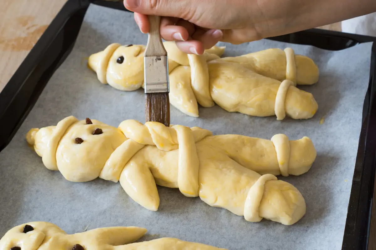Teig auf einer leicht bemehlten Fläche durchkneten und in 6 Portionen teilen. Jede Portion zu einer Figur formen – traditionell mit Kopf, Armen und Beinen. Rosinen als Augen einsetzen, Mandeln als Knöpfe oder Verzierungen.