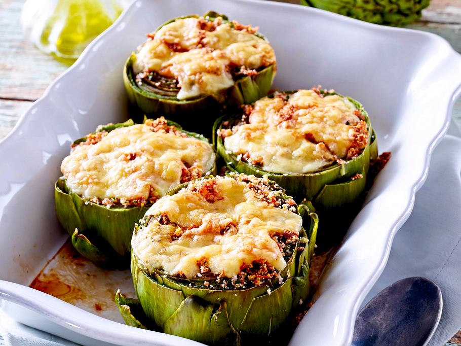 Wer es herzhafter mag, kann die ArtischockenhĂ€lften mit einer Mischung aus Semmelbröseln, Parmesan, Knoblauch und Petersilie bestreuen und im Ofen kurz ĂŒberbacken â auĂen knusprig, innen zart!