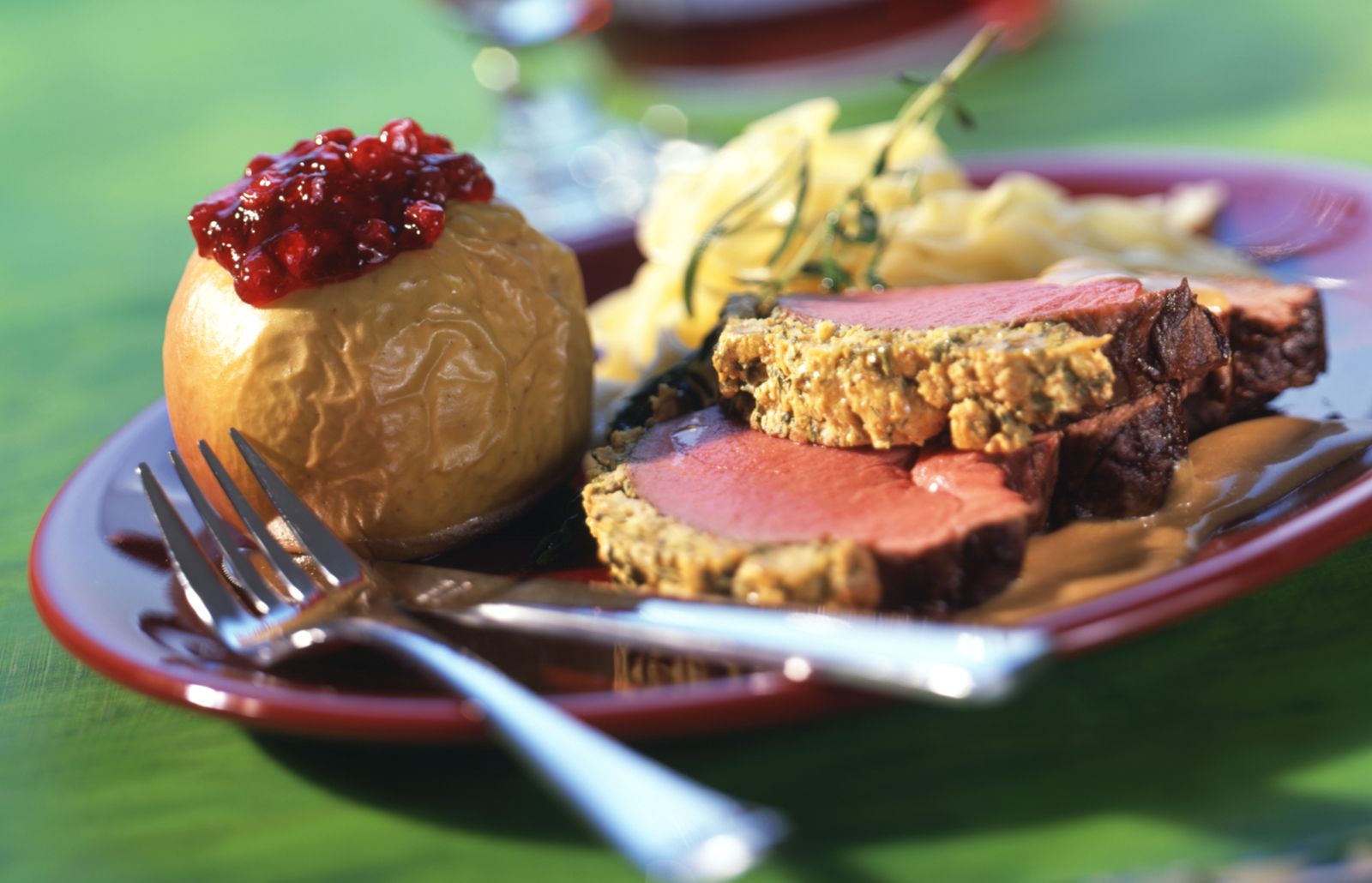 Mit Senf-Kräuter-Kruste: Die Rehkeule vor dem Braten mit Senf bestreichen und mit frischen Kräutern panieren.