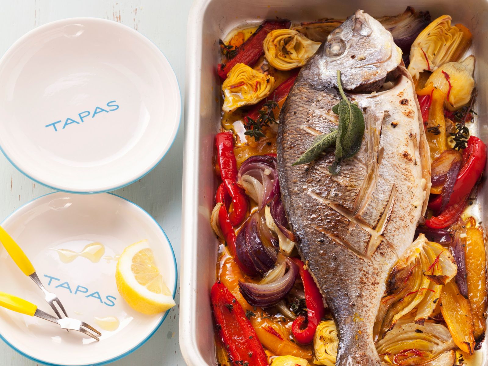 Heize den Ofen auf 200 °C (Ober-/Unterhitze) vor. Lege die Doraden auf das vorbereitete Gemüse in die Form oder direkt auf ein mit Backpapier ausgelegtes Blech.