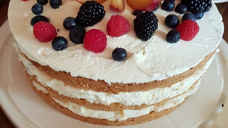 Statt Beeren kannst du auch Pfirsiche, Kirschen oder Mango verwenden. Auch eine Schicht Marmelade passt hervorragend zwischen die Böden.