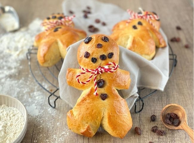 Den Teig in 4–6 Portionen teilen. Jede Portion zu einer ovalen Rolle formen, dann Kopf, Arme und Beine einschneiden. Anschließend nach Belieben mit Rosinen oder Mandeln verzieren.