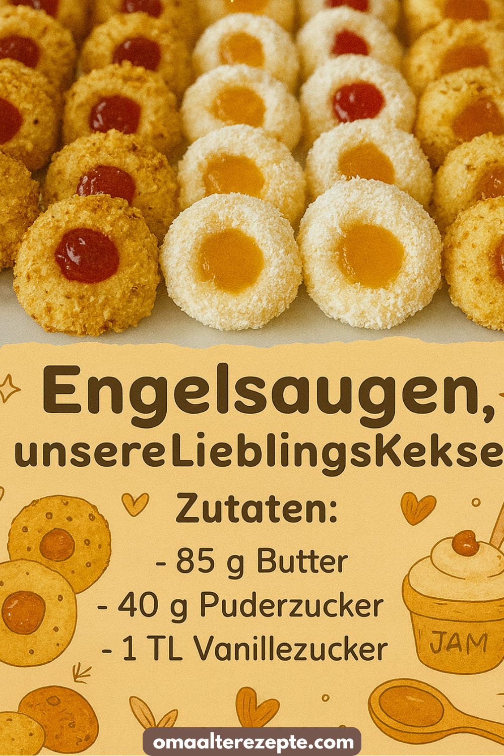 Engelsaugen – auch als Husarenkrapferl, Kulleraugen oder Thumbprint Cookies bekannt – sind eine Mischung aus klassischem Mürbeteig und fruchtiger Marmelade. Ihre typische Vertiefung entsteht durch den leichten Druck eines Fingers oder eines Holzlöffels. Die Kombination aus buttrigem Teig und zarter Füllung macht sie zu einem einzigartigen Geschmackserlebnis.
