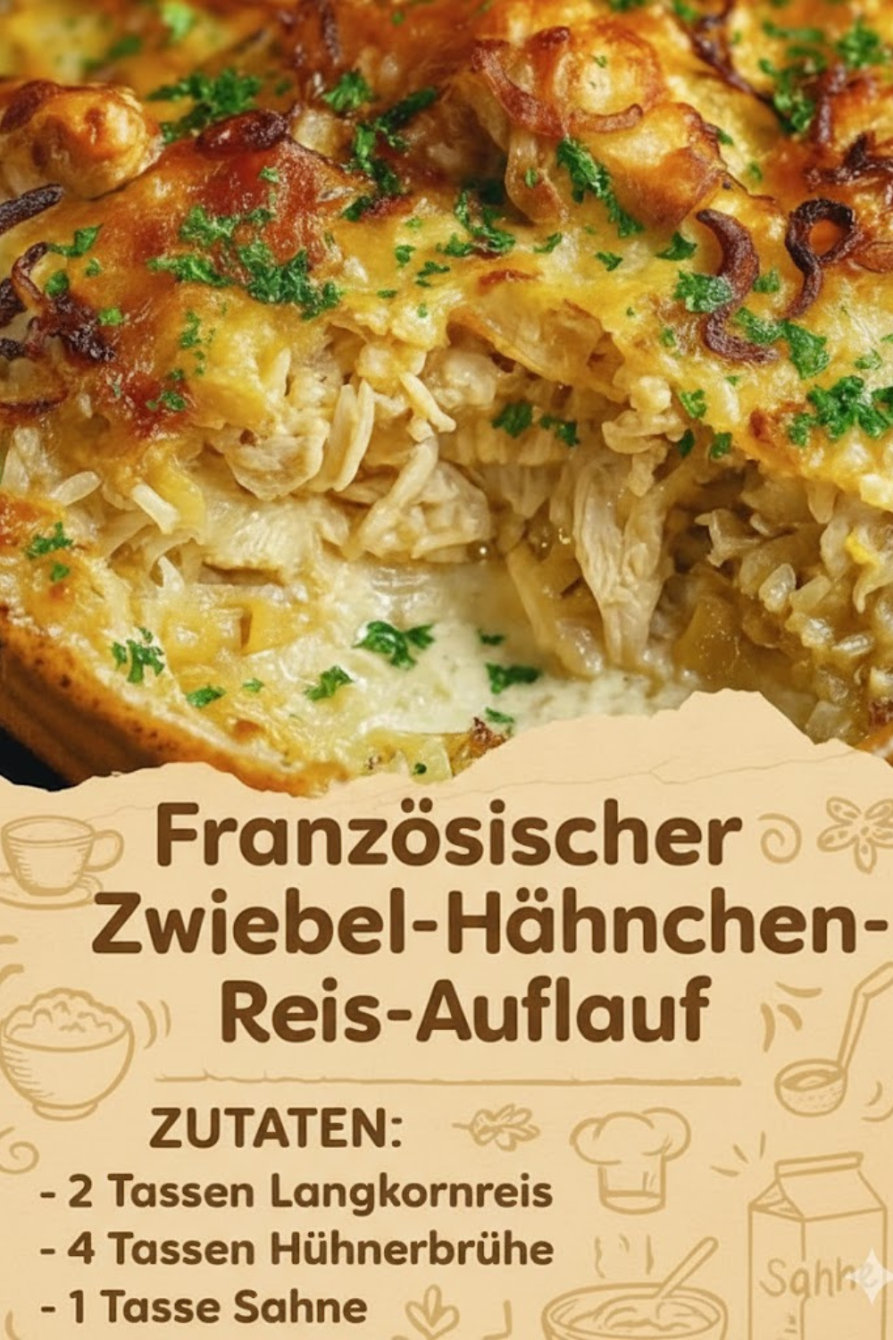 Wenn es um herzhafte und zugleich raffinierte Gerichte geht, ist der französische Zwiebel-Hähnchen-Reis-Auflauf, unwiderstehlich eine wahre Gaumenfreude. Mit seinem aromatischen Zusammenspiel aus saftigem Hähnchen, karamellisierten Zwiebeln, cremigem Käse und perfekt gegartem Reis begeistert dieses Gericht nicht nur den Gaumen, sondern auch das Auge. Ideal für Familienessen, gemütliche Abende oder sogar festliche Anlässe – dieser Auflauf vereint Einfachheit mit französischem Flair.