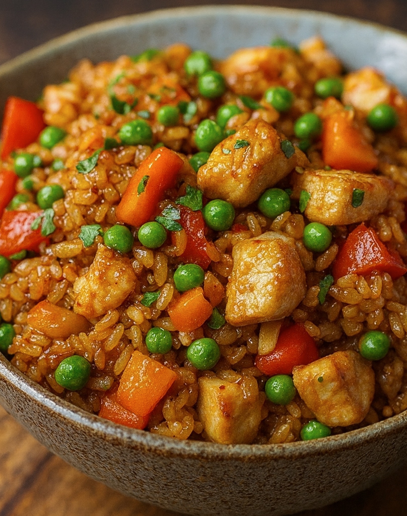 Probiere es aus und genieße Gebratener Reis mit Gemüse und Hähnchen aromatisch, bunt und alles aus einem Topf – ein echter Allrounder in deiner Küche!