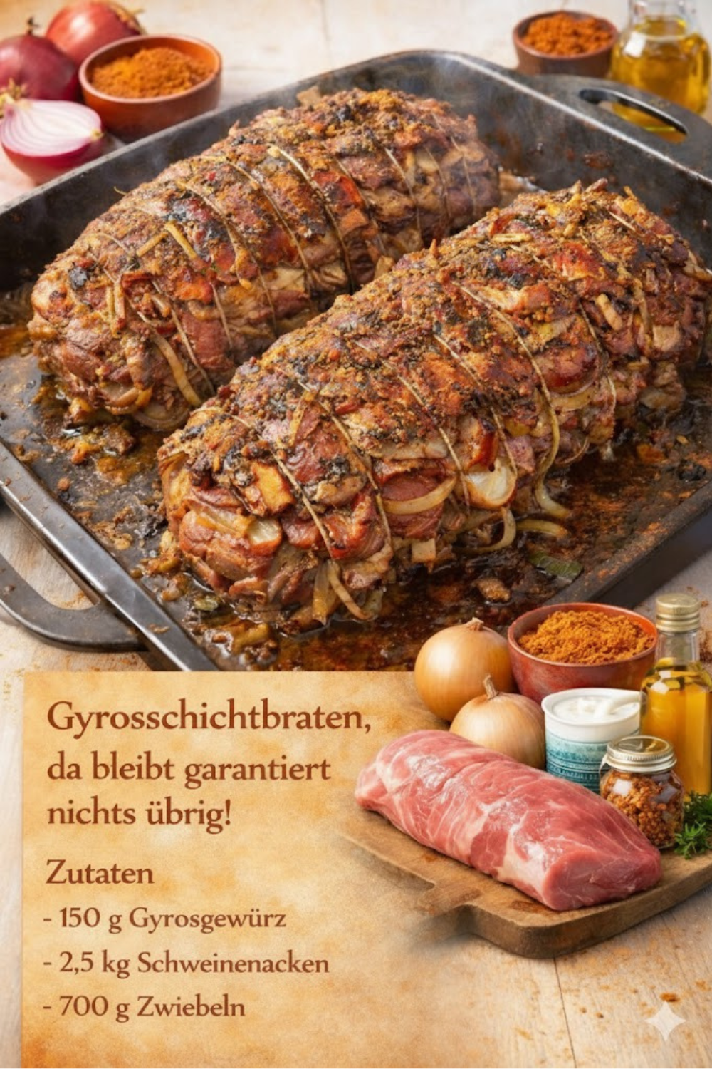 Wenn es um herzhafte, aromatische Fleischgerichte geht, die die ganze Familie begeistern, ist der Gyrosschichtbraten ein echter Gewinner. Gyrosschichtbraten, da bleibt garantiert nichts übrig! – ein Satz, der nicht übertrieben ist, denn dieses Gericht verbindet saftiges Fleisch, würzige Marinaden und eine unwiderstehliche Kruste zu einem kulinarischen Highlight, das auf jedem Esstisch für leuchtende Augen sorgt. Ob für den Sonntag, ein Familienfest oder ein gemütliches Abendessen, der Gyrosschichtbraten überzeugt durch Geschmack, Optik und die einfache Zubereitung.