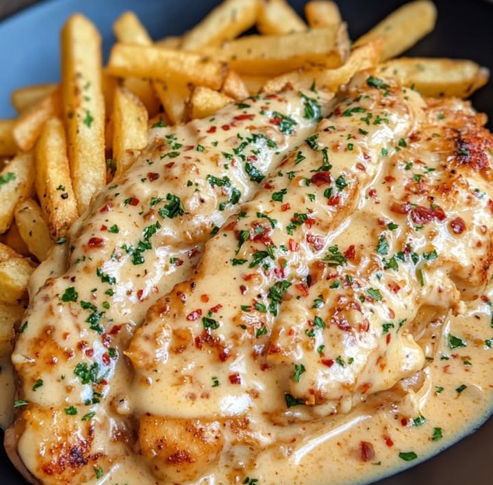 Hähnchenfilet in würziger, cremiger Knoblauch-Parmesan-Sauce mit Pommes Frites ist mehr als nur ein einfaches Hähnchengericht – es ist ein kulinarischer Genussmoment.
