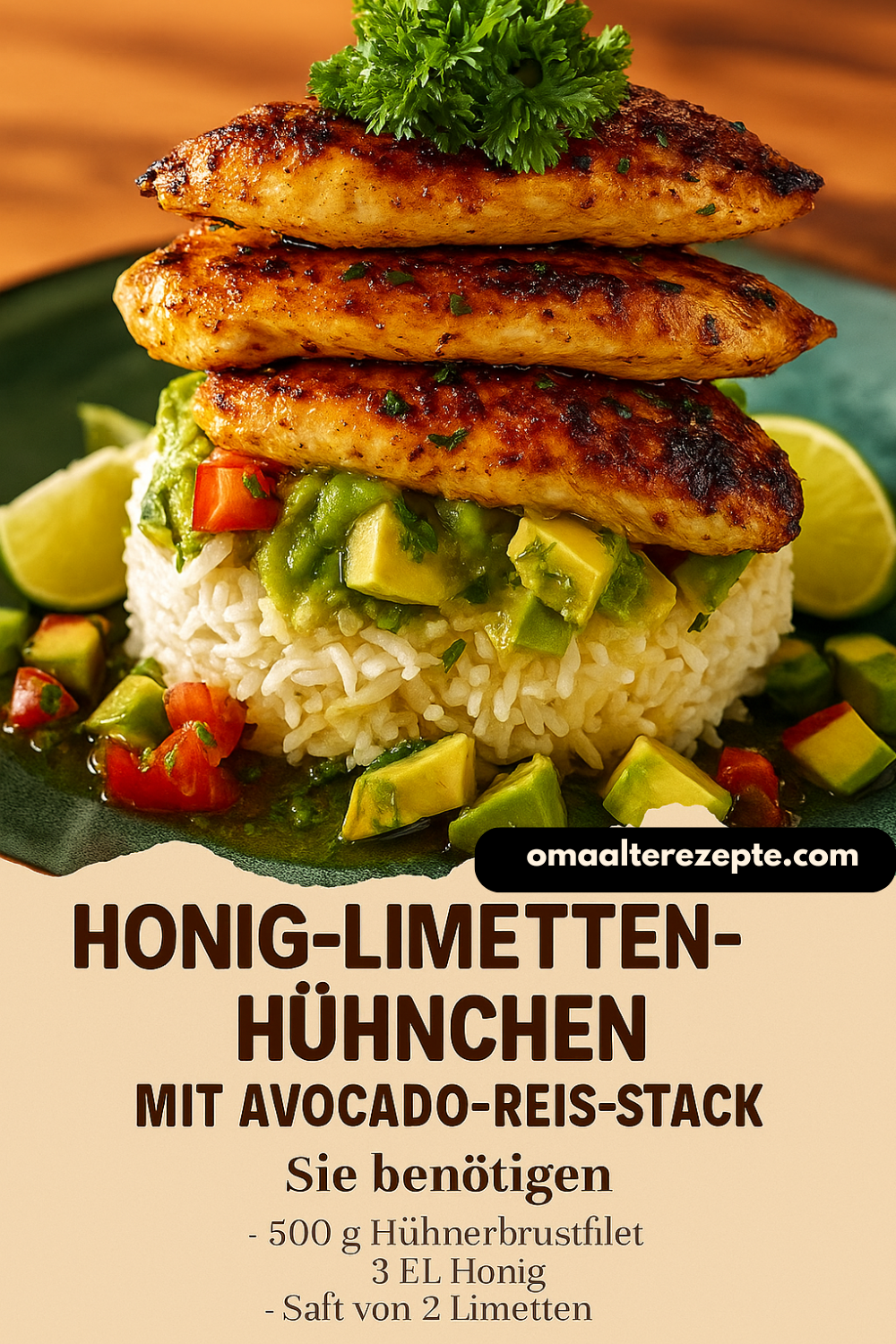 Mit frischen Kräutern und Limettenscheiben dekorieren – fertig ist dein Honig-Limetten-Hühnchen mit Avocado-Reis-Stack.