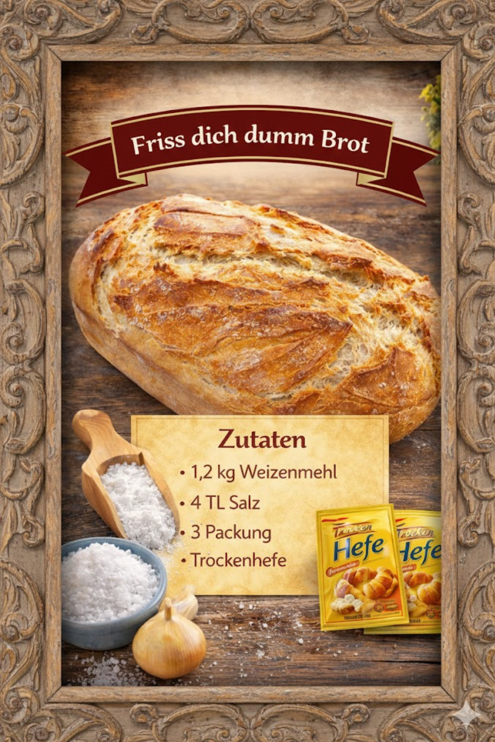 Für ein typisches Rezept „Ich backe mein Brot nur noch SO, Friss dich dumm Brot in 5 Minuten“ benötigst du: