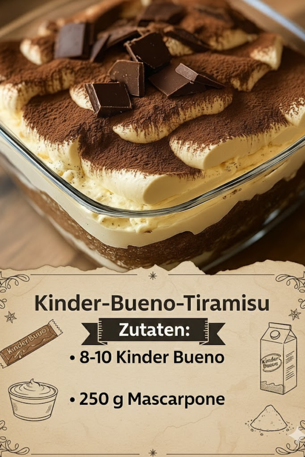 Schlüsselworte für SEO: Kinder-Bueno-Tiramisu, schokoladiges Tiramisu, Dessertideen für Kinder, Mascarpone-Tiramisu, süßer Genuss, Familien-Dessert, einfache Tiramisu-Rezepte