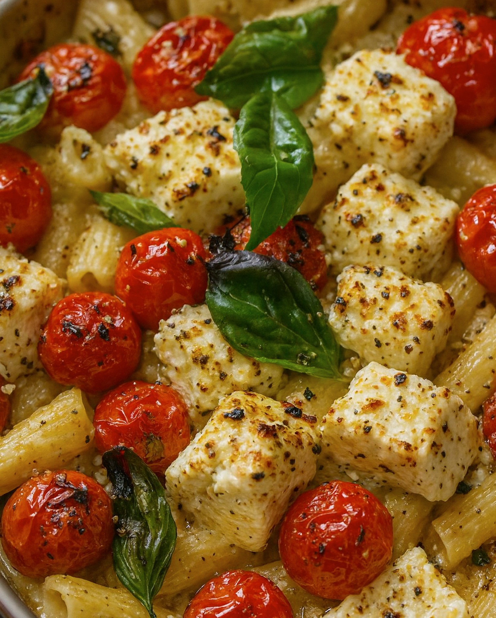 Ofen-Feta-Pasta ist ein einfaches Nudelgericht, bei dem Feta-Käse zusammen mit Tomaten, Knoblauch und Gewürzen im Ofen gebacken wird, bis der Käse schmilzt und eine cremige Soße entsteht. Danach werden die gekochten Nudeln direkt in die Mischung gegeben, wodurch ein unwiderstehliches, samtiges Gericht entsteht.