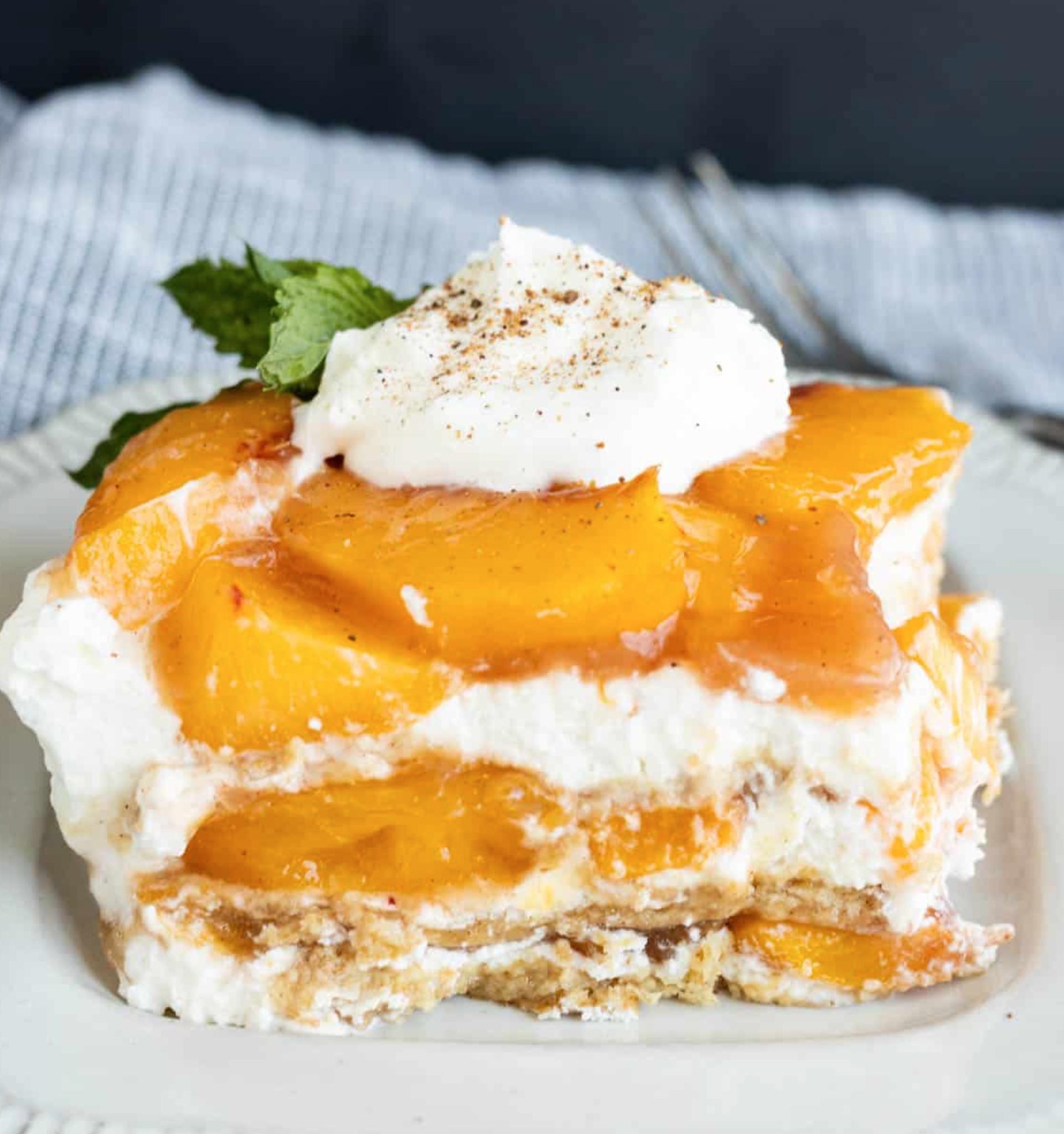 Neben dem Geschmack spielt auch die Optik eine Rolle: Die leuchtenden Pfirsiche auf der weißen Creme machen die Torte zu einem echten Hingucker.