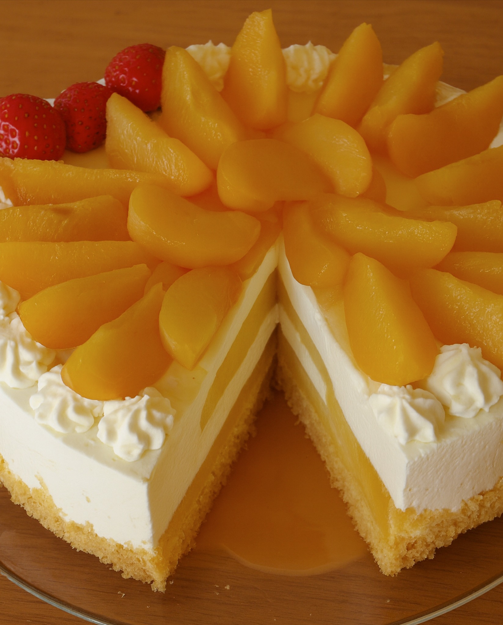Vegane Pfirsich-Torte: Mit pflanzlicher Sahne, Agar-Agar und veganem Biskuit.