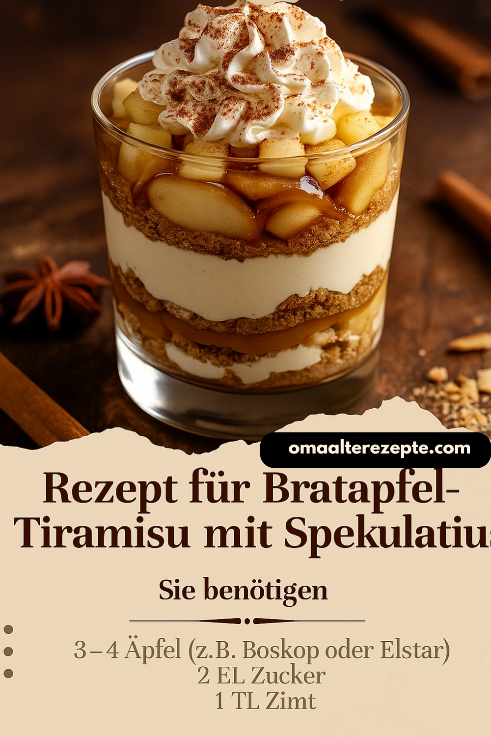 Eine beliebige Reihenfolge: Creme → Bratapfel-Stückchen → Spekulatius → Creme → etc. Entscheidend ist die Kombination von Creme, Frucht und Crunch. Ein gutes Rezept für ähnliche Schichtung findest sich hier. Life Is Full Of Goodies+1