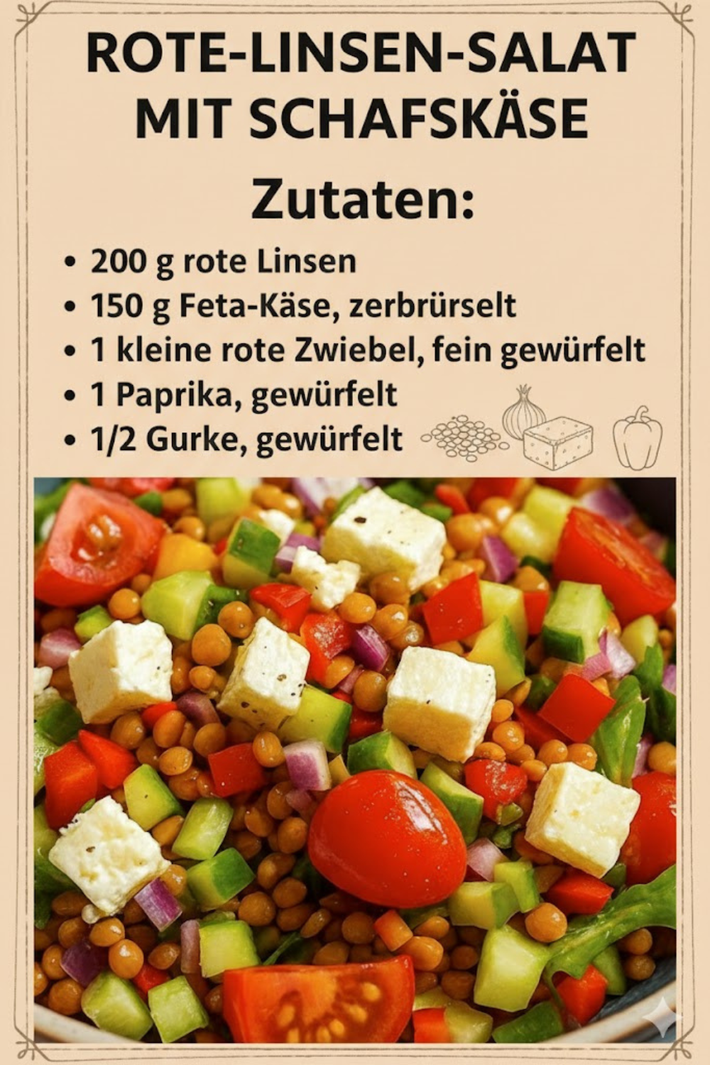 Ein frischer Salat, der nicht nur sättigt, sondern auch den Gaumen verwöhnt – das ist der rote Linsensalat mit Schafskäse mediterran, frisch & einfach köstlich. Dieses Rezept vereint die gesunden, proteinreichen roten Linsen mit dem würzigen Geschmack von mediterranem Gemüse und cremigem Schafskäse. Perfekt für den leichten Mittagstisch, als Beilage zum Grillabend oder sogar als Meal-Prep-Lösung für die ganze Woche.