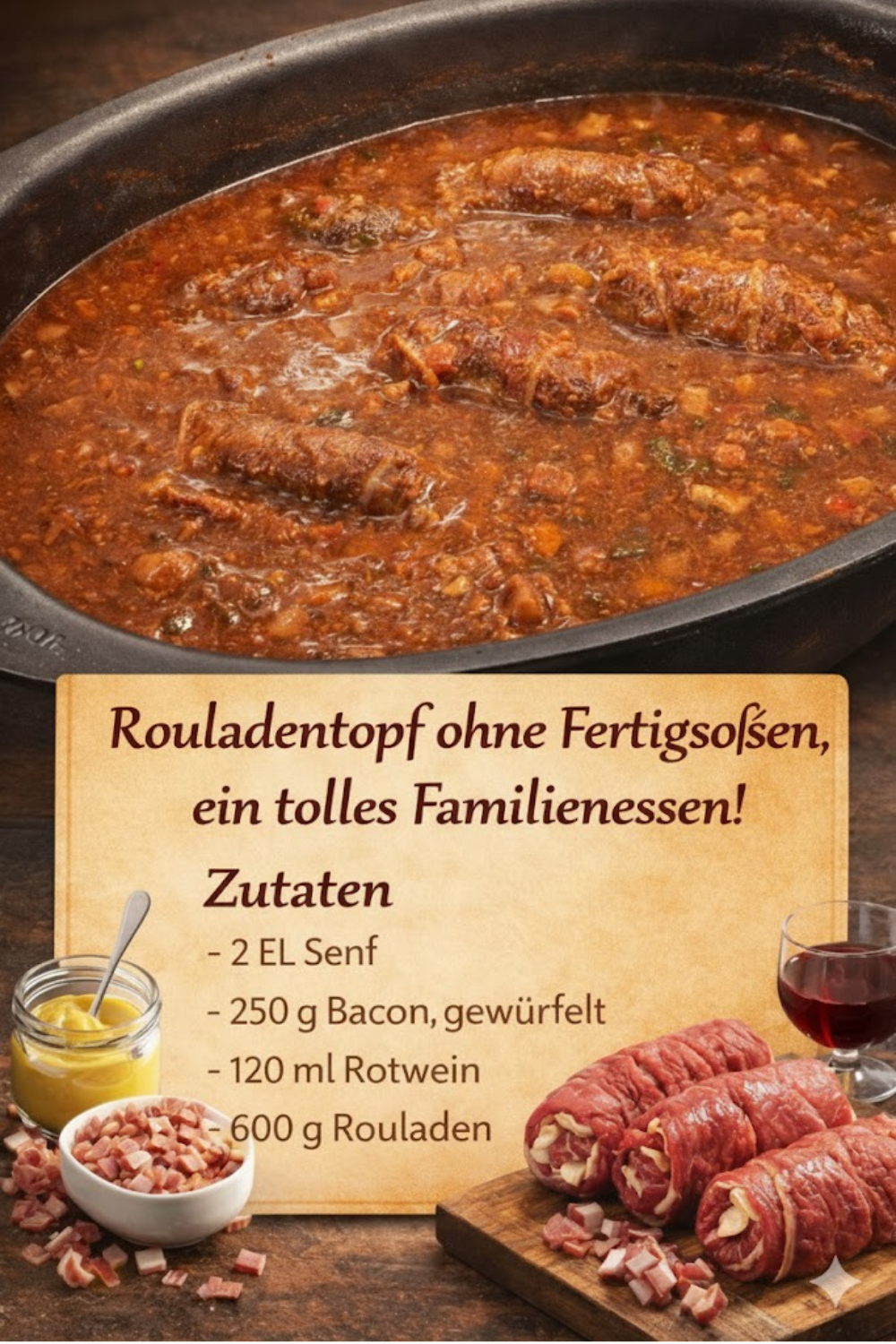 Der Rouladentopf ohne Fertigsoßen, ein tolles Familienessen! ist ein Gericht, das Tradition und Genuss perfekt vereint. Mit frischen Zutaten, viel Liebe zum Detail und der Möglichkeit, es nach eigenen Vorlieben anzupassen, wird es garantiert zum Favoriten bei Kindern und Erwachsenen gleichermaßen.