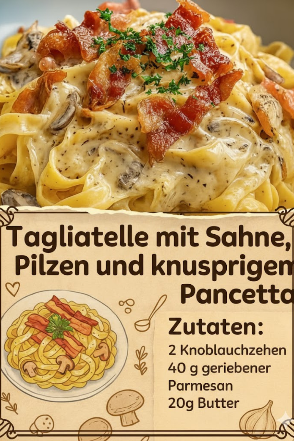 Tagliatelle mit Sahne, Pilzen & knusprigem Pancetta, voller Genuss