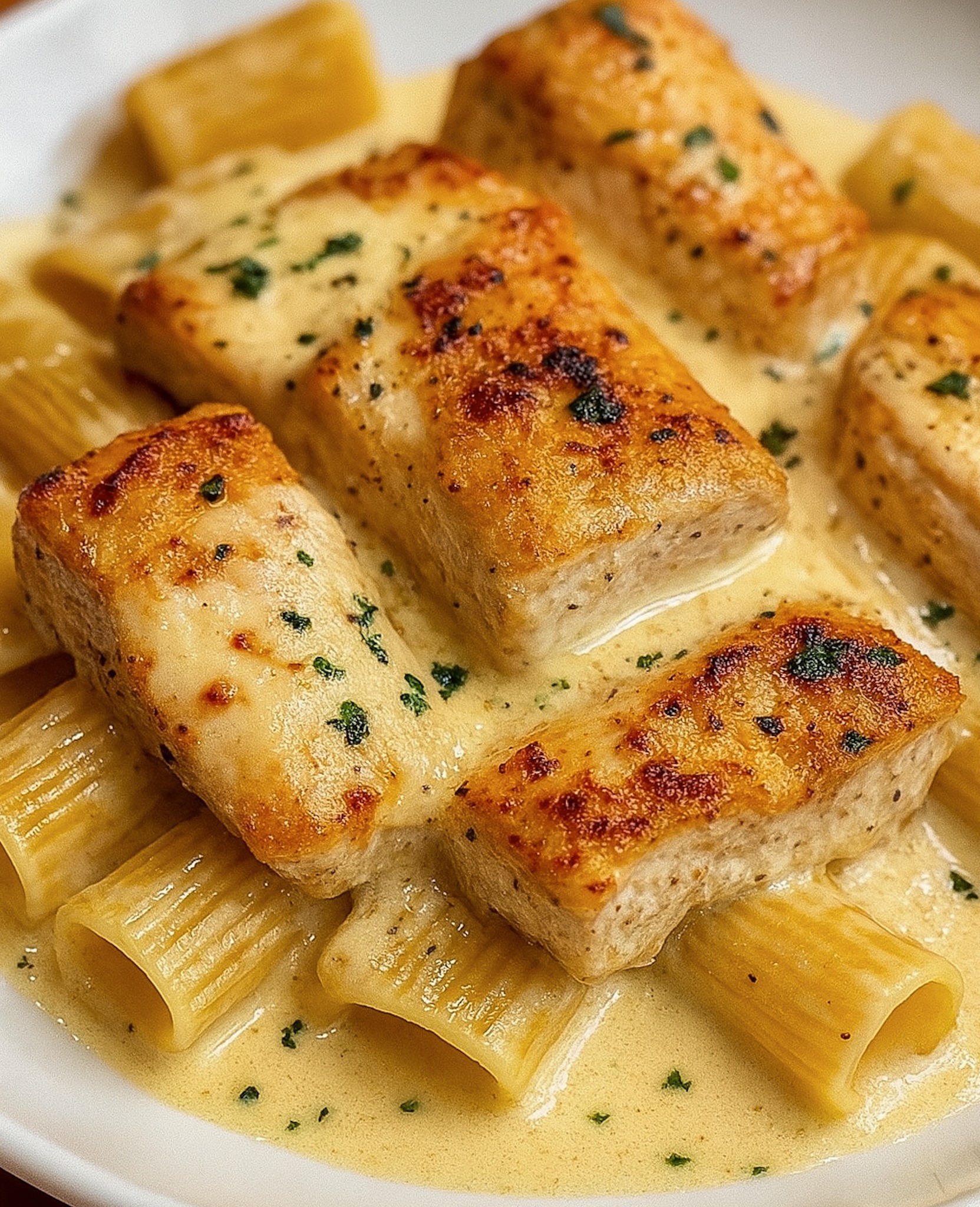 Rigatoni sind dicke, röhrenförmige Nudeln, die jede Sauce hervorragend aufnehmen. Besonders bei cremigen und würzigen Saucen, wie bei diesem Rezept mit Knoblauch, Parmesan und Hähnchen, sorgen Rigatoni dafür, dass jeder Bissen voller Geschmack ist. Im Vergleich zu Spaghetti oder Penne bleibt die Sauce in den Rillen der Rigatoni haften, wodurch das Gericht intensiver schmeckt.